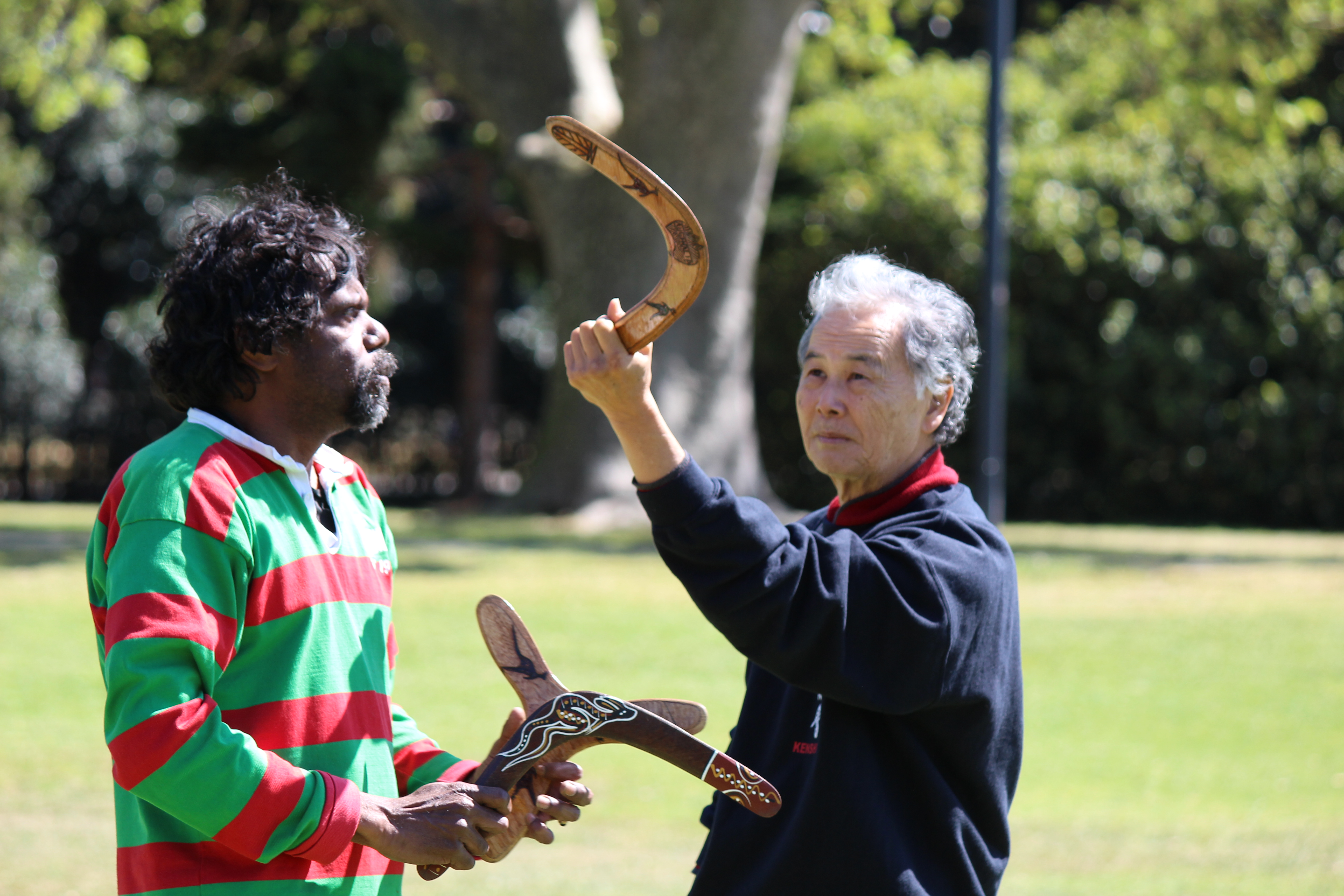 Albert teaches Sensei Hokama how to throw a boomerang