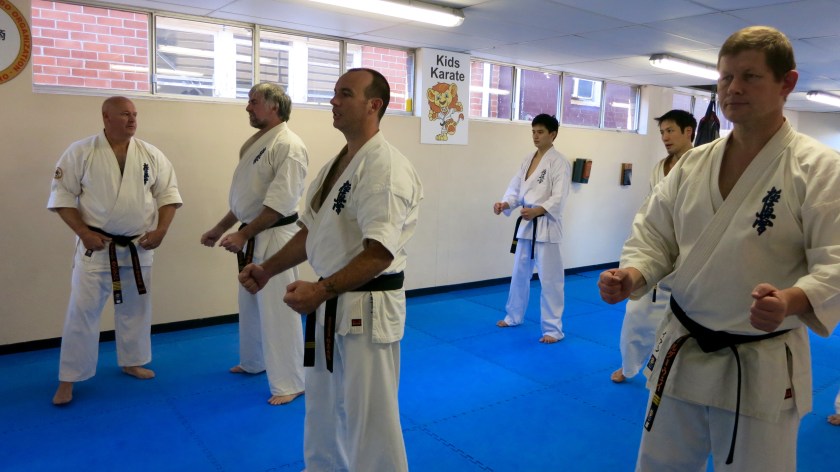 Previous Image Next Image BlackBeltJune2016 – 4 Shihan Rick Cunningham watches Sensei Mark, Sensei Jon & Sensei Ian Holdaway